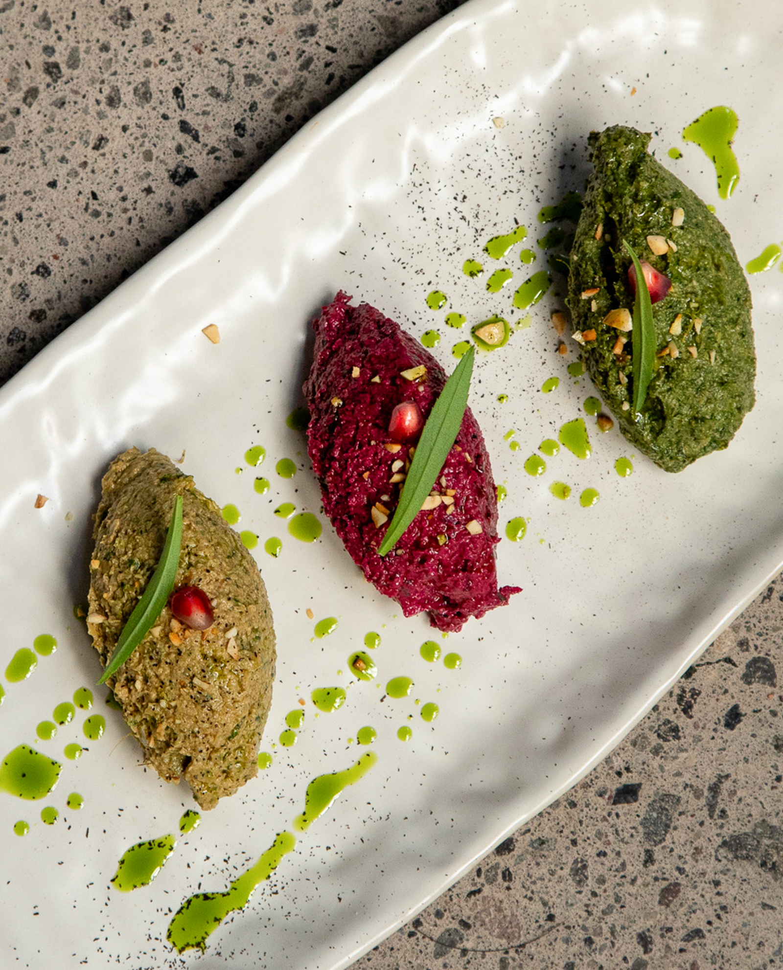Traditional Georgian vegetable spreads with garlic & herbs: beet, walnuts, lentil